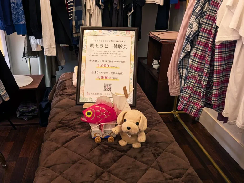 used store Replay様へ出店しました 2026.03.17 昨日はReplay様へ3回目の出店でした😊 1月、2月と開催ができず久々の開催となりました♪ Replay様との出会いは、実は1年ぐらい前で、知人に誘われてランチを食べに行ったことがきっかけでした! その時はまだ私は腸セラピストの資格を持っていなくて、今の自分の事が想像もしていなかったけれど…ありがたいことに、昨年11月より間貸し出店させていただけることになりました。 ベッドスペースはお洋服に囲まれる不思議な空間ですが、カウンターやテーブル席からは目の届かないエリアになりますので、安心して施術を受けていただけます。 私も巻の鯛車欲しいです😅どなたか、購入?出来るところがありましたらご紹介いただけると嬉しいです。 このイベントの醍醐味の一つは、腸活ランチ✨ 献立は毎回相談しながら考えています。 が、私は料理のセンスがあまりないので…ほとんどお任せになってしまっていますが、いつも期待以上のお料理をご用意して下さいます。 普段はパスタとカレーの、わりとガッツリ目な感じの洋食屋さんですが、この時だけはママさん手作りの和定食がいただけます😊 今回の献立は塩こうじに漬けた焼きサーモン丼でした。 ご飯にはもち麦が使用されており、腸活との相性もバッチリです! お吸い物のハートのお麩も可愛いですね😊 ただ一つ寂しかったのが、今回は平日でしたので…😅 Replay様出店は土日に開催して欲しいというお声も多く、やはり皆様のリクエストの通りに、次回からはなるべく土曜日にしようと思います💡 という訳で、次回の出店は 4月11日(土)を予定しております! ご予約も喜んで承りますので、ご連絡お待ちしております。 出店情報出張型腸セラピー腸セラピー西蒲区