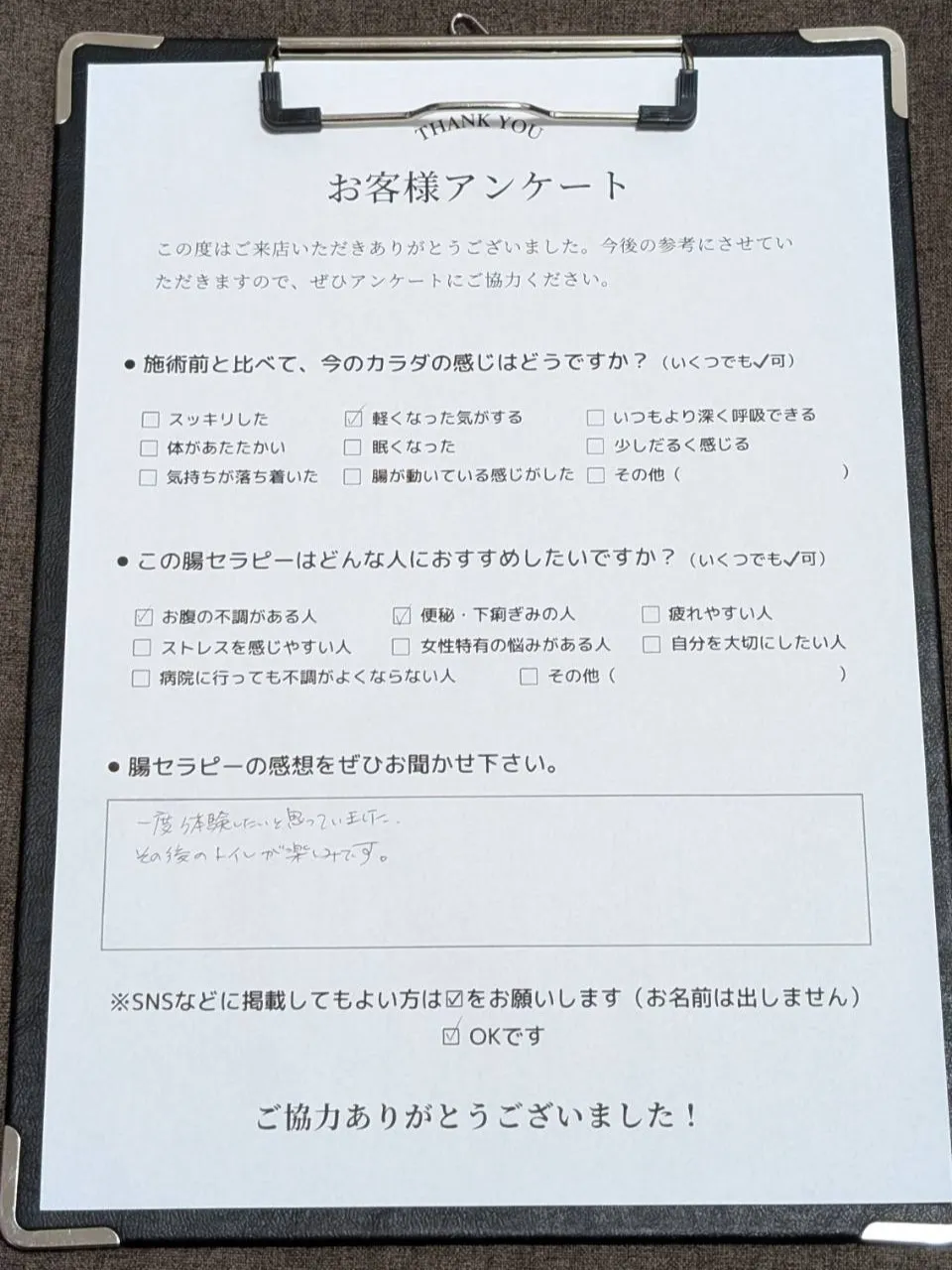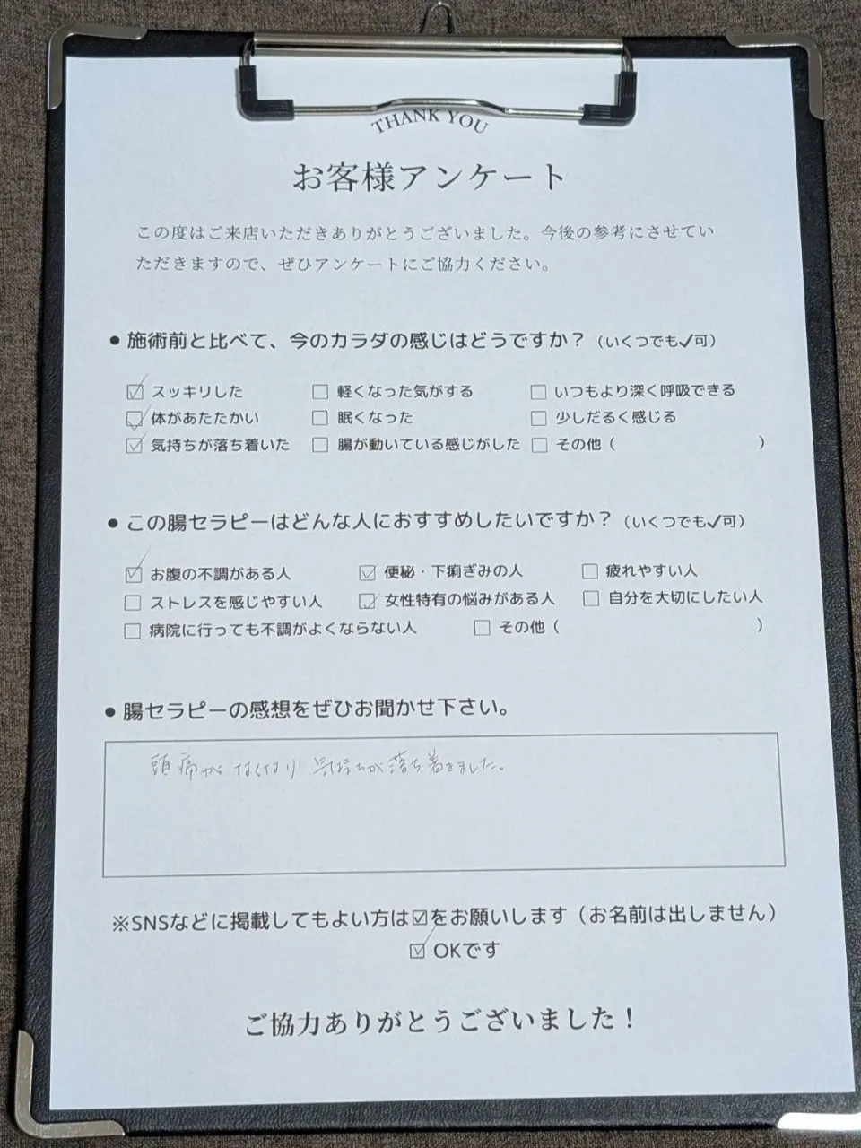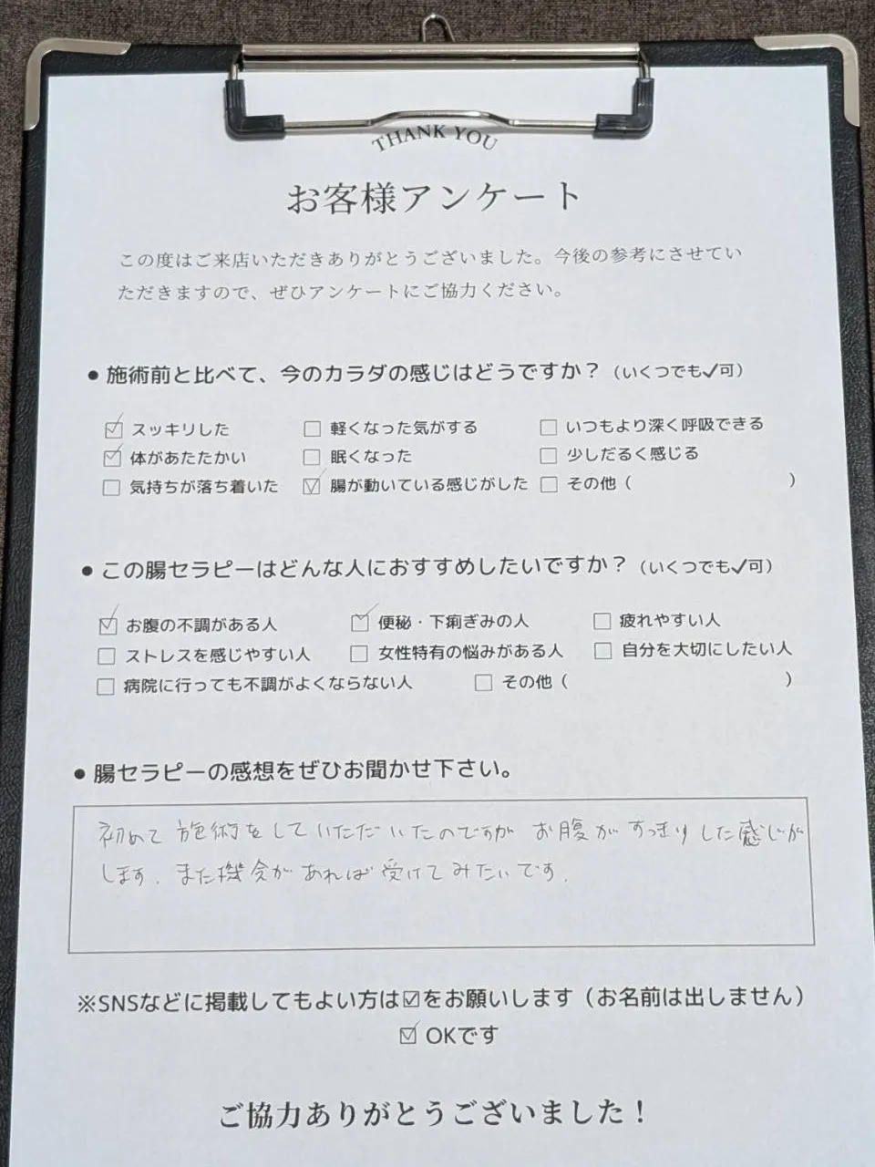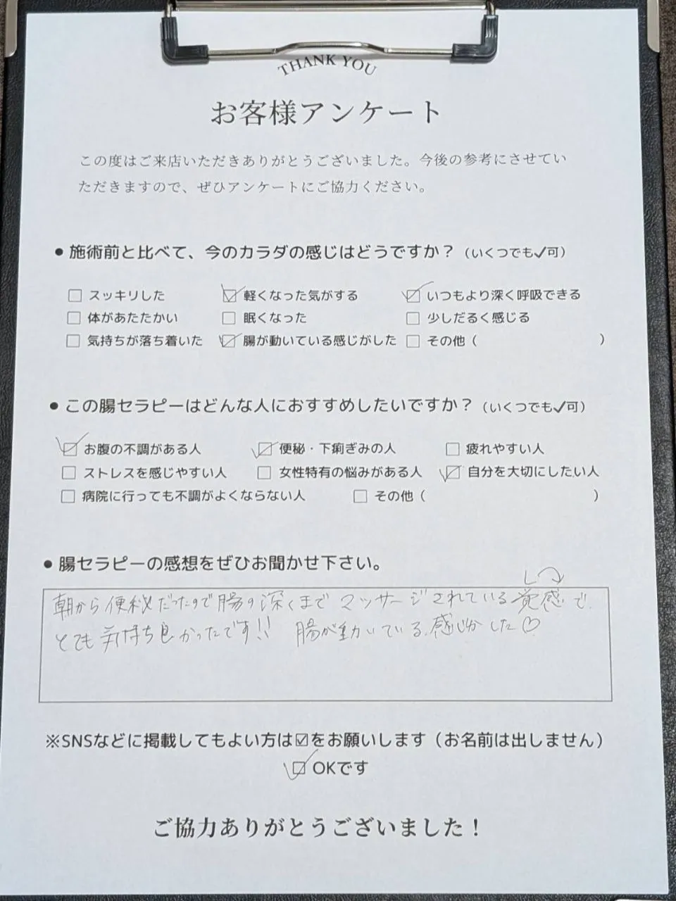 当方の腸セラピーを受けられたお客様から、嬉しいお声をいただいております。