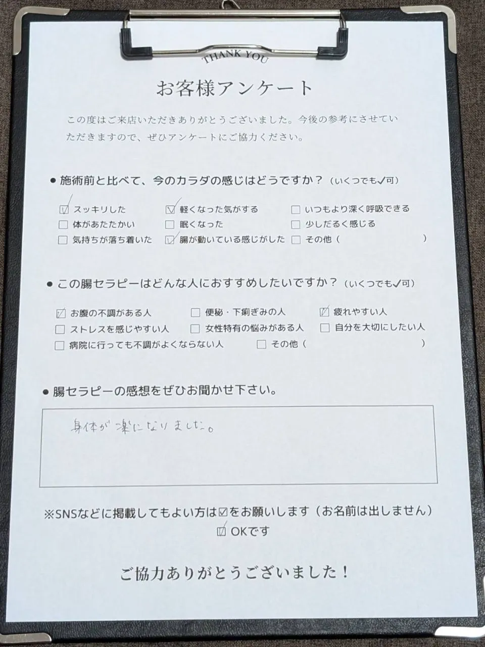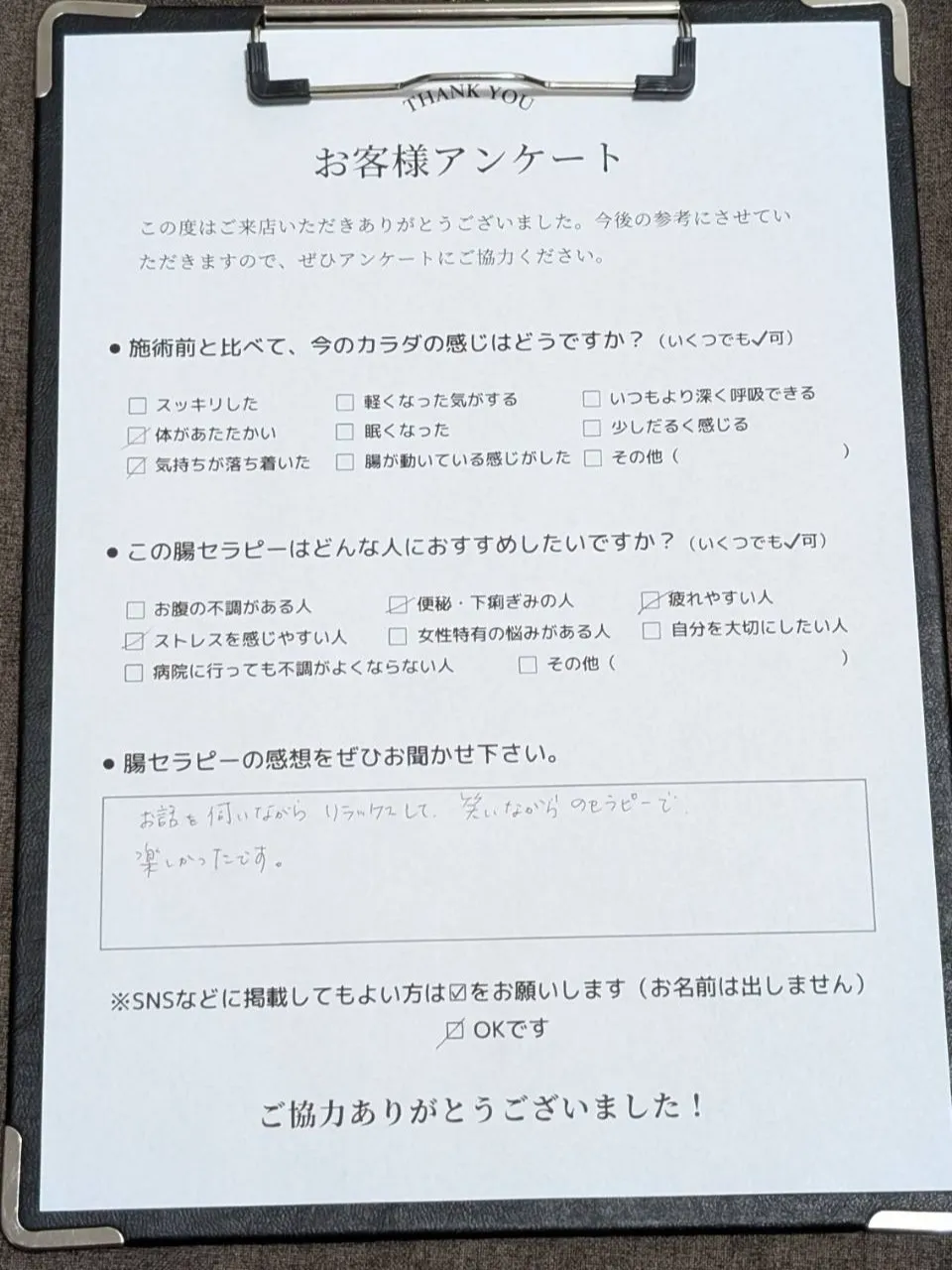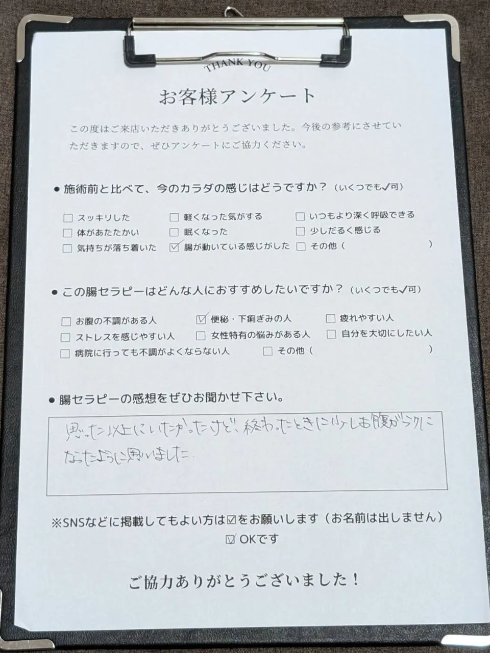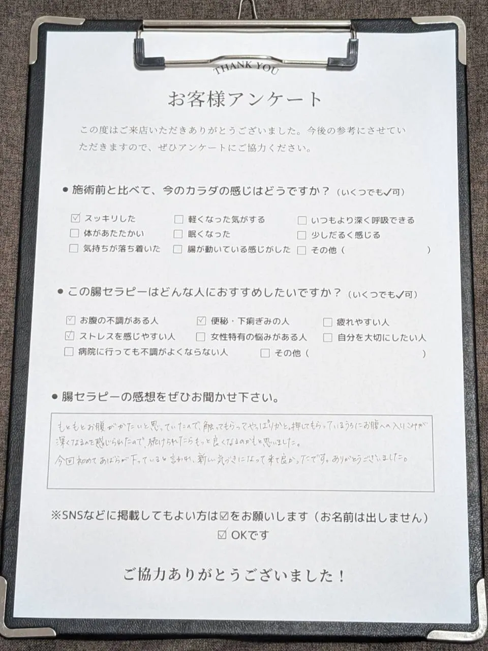 当方の腸セラピーを受けられたお客様から、嬉しいお声をいただいております。
