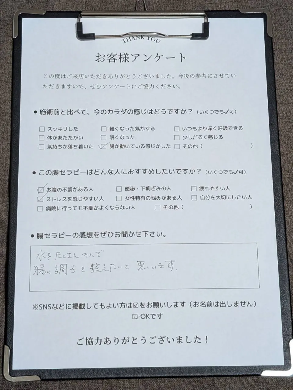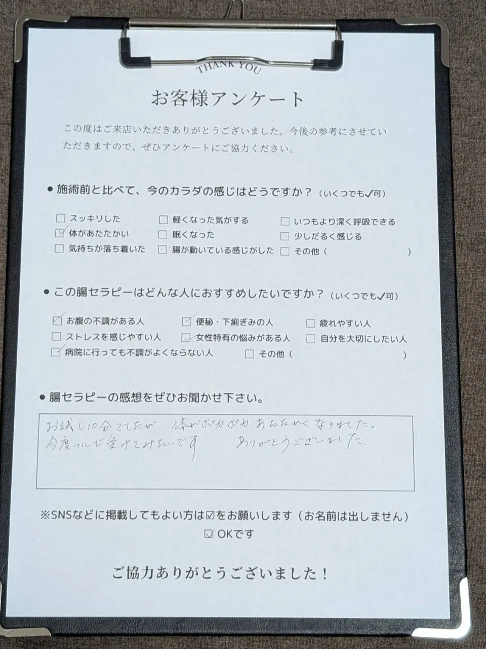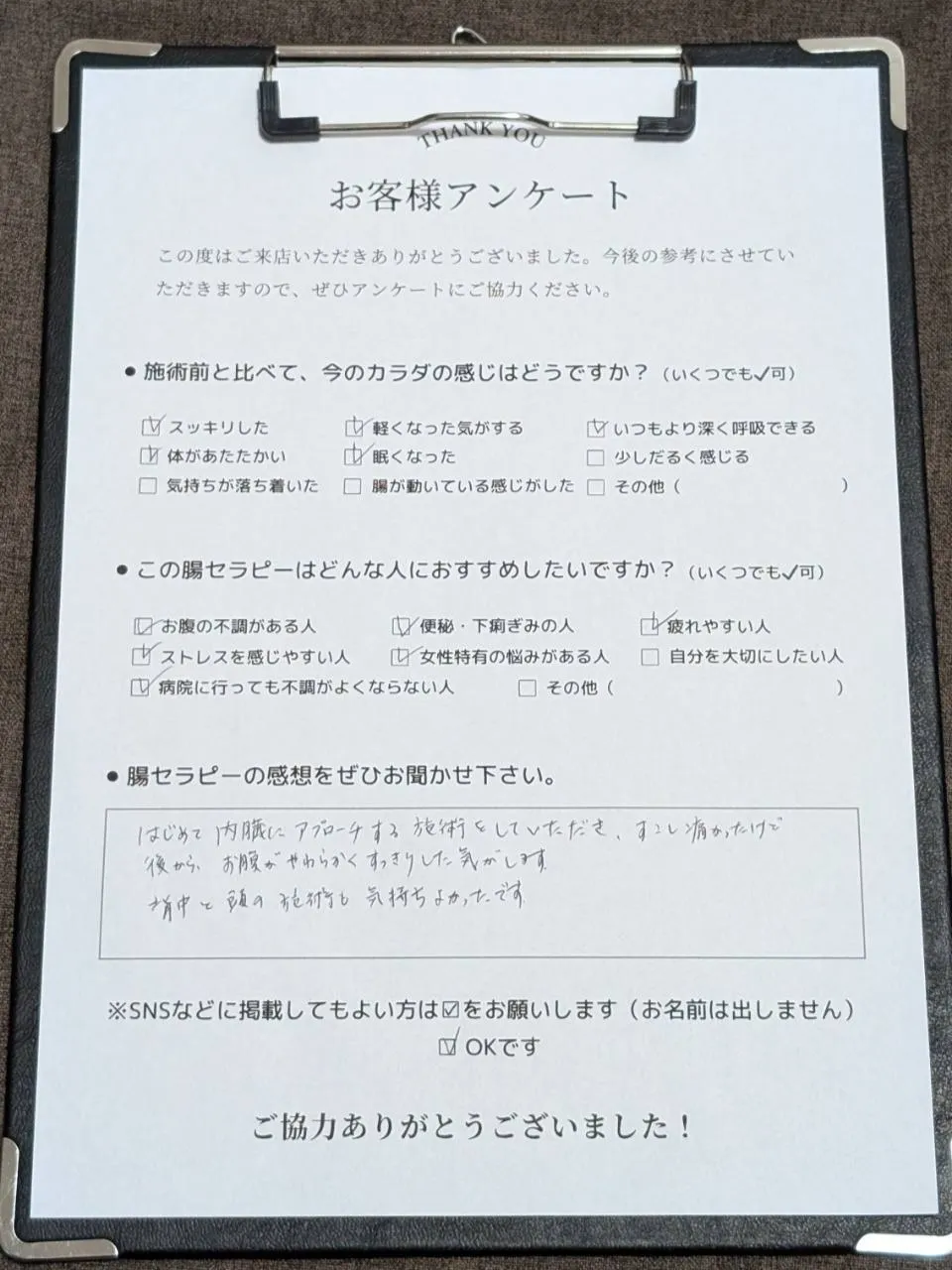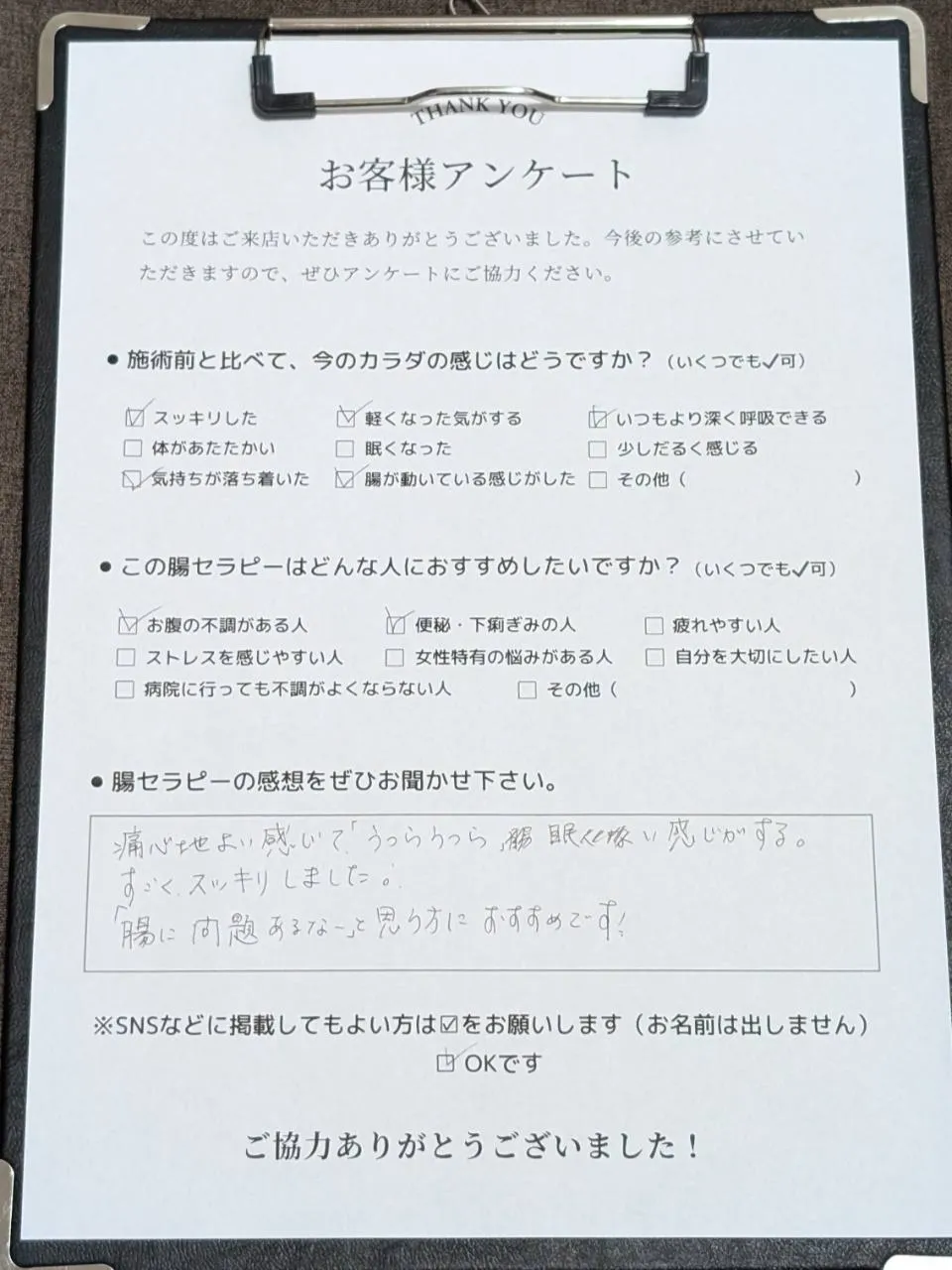 当方の腸セラピーを受けられたお客様から、嬉しいお声をいただいております。